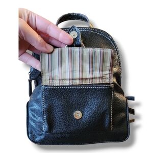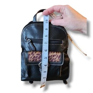 Like-new faux leather and leopard print. Front snap pocket and zipper pocket. Inside there is one large zipper pocket and 2 card pockets. The straps are Adjustable. All zippers function smoothly.