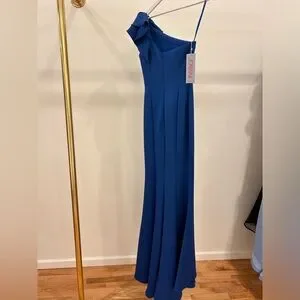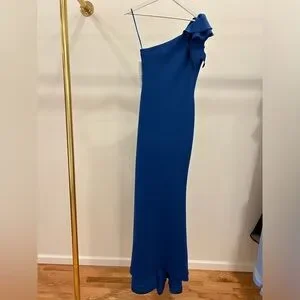 Stunning royal blue one-shoulder dress. Its elegant design and vibrant color make it a standout piece in any wardrobe.