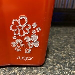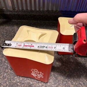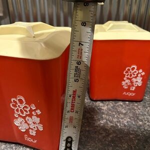 Charming vintage canister set in orange and cream. Features floral designs labeled for flour and sugar. See pictures for measurements. Hard plastic. No cracks or chips.
