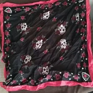 Stylish black bandana with skull and rose design. Perfect for adding an edgy touch to any outfit.