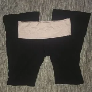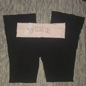 NEW WITH TAGS - flared black yoga pants with an emvroidered light pink fold-over waistband. Features PINK logo.