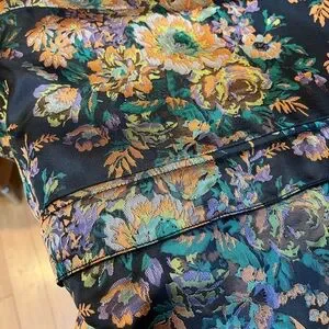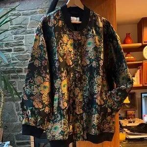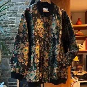 Chic black satin jacket with colorful floral design. Features an oversized fit and stylish look. Great for a dressy occasion or a statement with jeans.