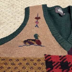 Wool vest with a v neck style. Has images of a mallard and teddy bear.