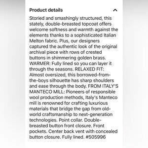Storied and smashingly structured, this stately, double-breasted topcoat offers welcome softness and warmth against the elements thanks to a sophisticated Italian Melton fabric. Plus, our designers captured the authentic look of the original archival piece with rows of crested buttons in shimmering golden brass. WARMER: Fully lined so you can layer it through the seasons. RELAXED FIT: Almost oversized, this borrowed-from-the-boys silhouette has sharp shoulders and ease through the body. FROM ITALY'S MANTECO MILL: Pioneers of responsible wool production methods, Italy's Manteco mill is renowned for crafting luxurious materials that bridge the gap from old-world craftsmanship to next-generation technologies. Point collar. Double-breasted button front closure. Front pockets. Center back vent with concealed button closure. Fully lined. Adventures defined by elements of wonder. The Cian Melton Greatcoat combines enduring structure with elegant Italian wool for a true statement gift that will last through the seasons.