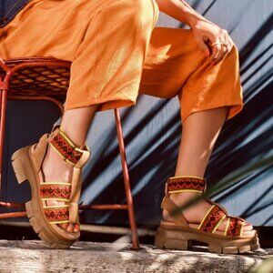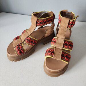 "EUC" Fantastic Looking Brown Suede Ashton Heritage Sandals By UGG. Suede/Leather Upper with Braiding/Textile Detail, Adjustable Velcro Ankle Strapping/Closure, Cushioned Foot Bed, 1.3/4" Rubber Platform & 2.5" Heel all Rubber Soles, Great Condition, No Wearing on Uppers, Minor Markings/Scuffing to Soles, Worn Twice:) Rt.228.00 approx.