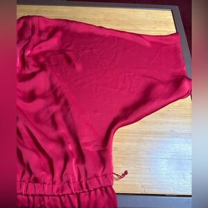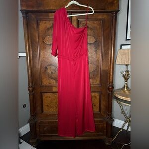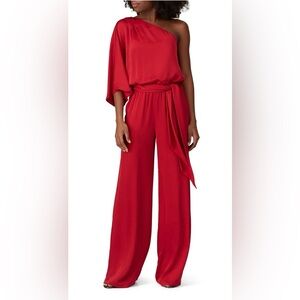 Red satin charmeuse Jumpsuit. Three-quarter sleeve. One shoulder neckline.