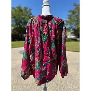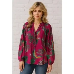 • Details: Tropical toucan print, monkey dot texture, balloon sleeves, beaded collar tie