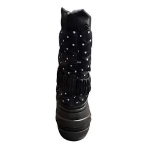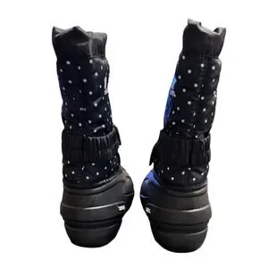 Perfect for deep snow. Waterproof upper, felt inner boot for warmth, and multi-directional lug sole for steady grip. Easy on and off. Unisex boots. Navy blue with white dots.