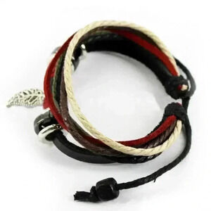 Leaf Black Leather Adjustable Bracelet Jewelry Womens or Mens Bangle