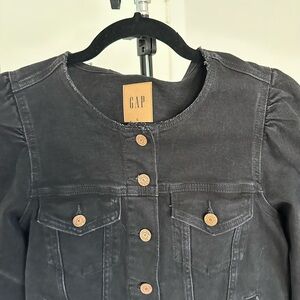 Chic dark denim jacket by GAP. Features stylish button details. Perfect for layering and everyday wear. Collarless with puffed sleeves and flattering seaming.