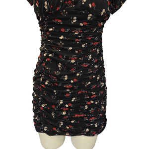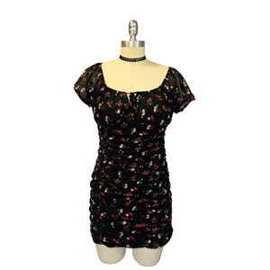 Vintage Y2K Ultra Flirt floral print micro mesh mini dress with milkmaid neckline, size small. In gently preowned condition, no flaws noted. Ruched skirt, fully lined. Lots of stretch.
