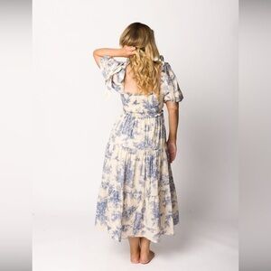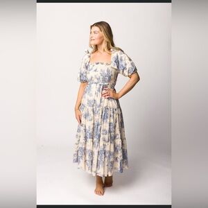Embrace elegance with this chic blue and cream midi dress. Ideal for any event, it features a flattering silhouette and classic design. Bonus, flowy design is also maternity-friendly.