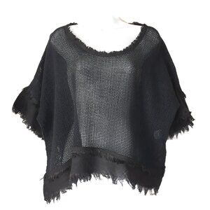 Black Open-Knit Asymmetrical Sweater Poncho Cotton Distressed Frayed Trim OSFM