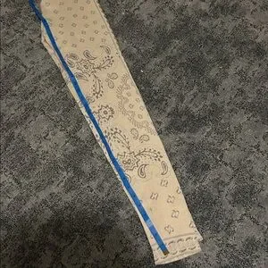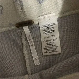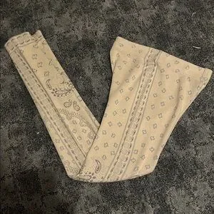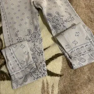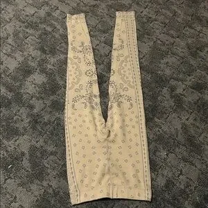 This is a pair of the free peoples Jimi Hendrix sweater leggings with a bohemian pattern. They are a size small but can stretch up to a medium as you can see in the video. They are cream and a blue gray almost lavender color. The color is very unique. It is on white, but it’s not a super white. It’s almost a creamy white color of leggings