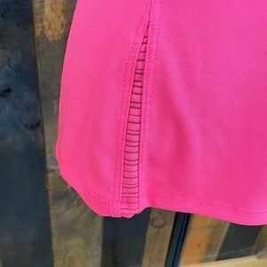 HIND hot pink v neck athletic shirt with mesh inserts, size S. 100% polyester. Approximate measurements are pit to pit flat 17”, length from shoulder approximately 24”.