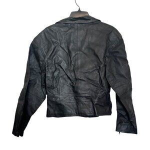 Stylish black leather jacket with zipper closures, belt detail, and vintage-inspired design. Perfect for casual or seasonal wear, adding flair to any look.
