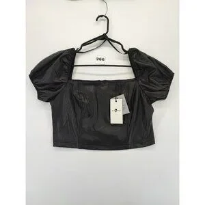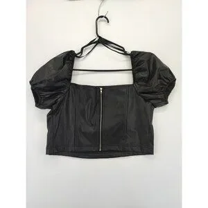 7 For All Mankind Women's Black Faux Leather Puff Sleeves Crop Top Size L