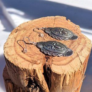 **Native American Women's Dangle earrings. Antiquated style Hand stamped 3-D Tribal designs. Sterling Silver. Silver Plated French wire posts Closure. Authentic handmade by artist Hallmark initial "VC" from Southwest US.