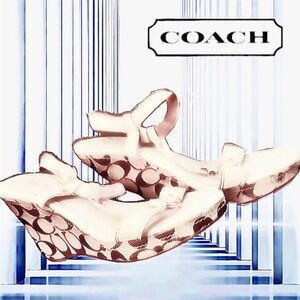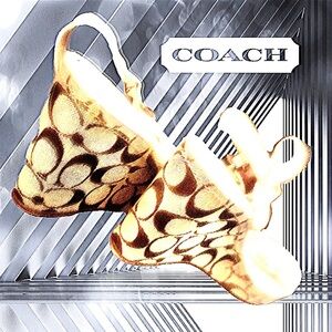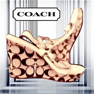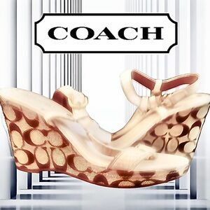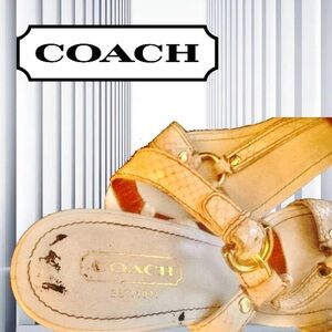 Chic Coach Maryalice gold wedges featuring the iconic Coach signature "C" canvas & luxe cream snakeskin-textured leather straps.