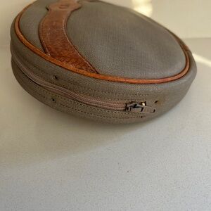 Rare vintage Christian Dior oval vanity/cosmetic case in canvas with genuine leather trim and the classic “CD” embossed front detail.