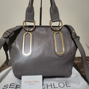 Chic Chloe soft taupe or Grey leather 2way bag with gold hardware no Tarnish lite scratching on hardware not noticeable. Perfect for everyday elegance comes with Dustbag and COA. No major callouts. size 14w x 16h without long straps 30h inches.