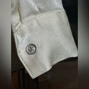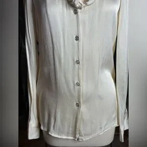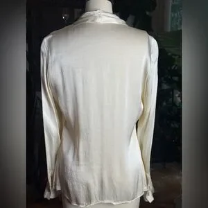 Stunning vintage 1980s cream silk blouse featuring an elongated bow neckline that can be styled loose, tied, or draped. Made from soft, fluid silk with a subtle sheen that catches the light beautifully. The blouse has long sleeves with tailored cuffs, a lightly tapered fit through the body, and a gorgeous hand-feel that suggests this may have been a custom-made or small-designer piece.