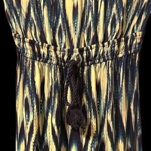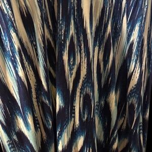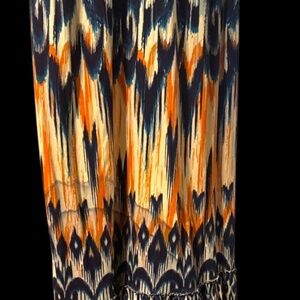 This elegant maxi dress features a striking blue and orange pattern, perfect for any occasion. Its strapless design and flowy silhouette offer both comfort and style.