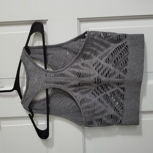 Stylish and edgy crop top by ALO Yoga. Features a unique distressed design. Ideal for casual wear or workouts.