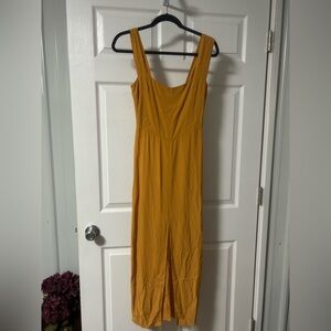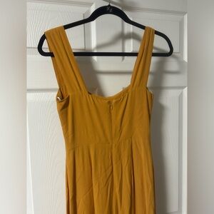 Chic mustard midi dress by Reformation. Features a sleek design with a front slit. Ideal for versatile styling.