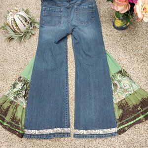 3773 Size 10 Upcycled Ashley Judd Bleach Dyed Brown And Green Bell-Bottoms. Waist 17" inseam 31.5" rise 9".
