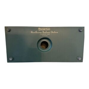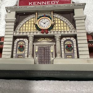 Charming lighted train station from Hawthorn Village. Features festive wreath and detailed architecture. Expertly packed bottom foam insert no box. Christmas themed holly bows