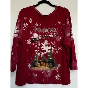 Vtg Red Christmas Pullover Shirt Santa Sleigh Reindeer Rhinestones Snowflake