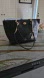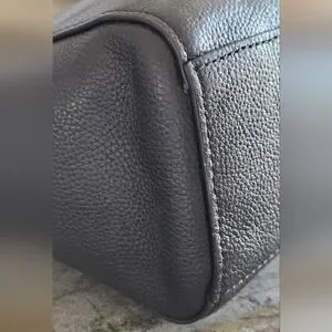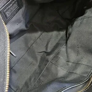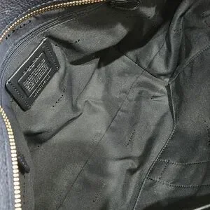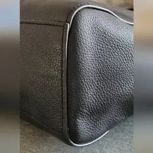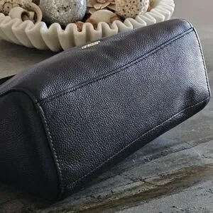 Coach Black Leather Tote Bag. This elegant bag is black pebbled leather, used in excellent condition. No scratches or tears. Turn-lock. The gold metal accents are in new condition, shiny, no signs of wear. Metal handtag. Beautiful, spacious, and durable.