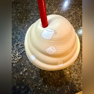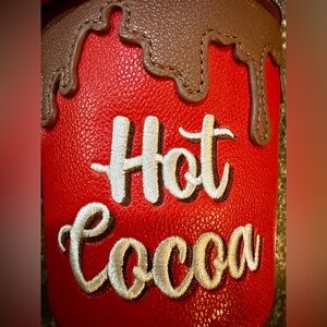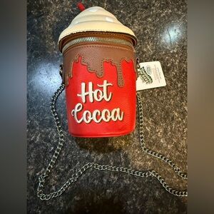 Fun red crossbody bag with embroidered Hot Cocoa (Dripping Chocolate) design. Features a whipped cream top WITH marshmallows and straw, two zippers and a solid, nicely weighted silver chain strap. Yummo!