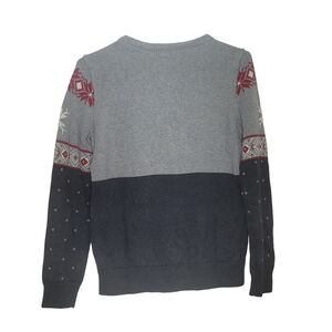 This is a new with tags Chaps women's crew neck holiday sweater in size M. The sweater features a gray upper section with a red and white fair isle pattern, including two black reindeer and a white snowflake. The lower section is a darker gray with small white snowflake-like patterns. The tag indicates it is 100% cotton and made in Bangladesh. The overall design is a festive, two-tone holiday theme.