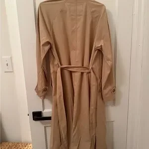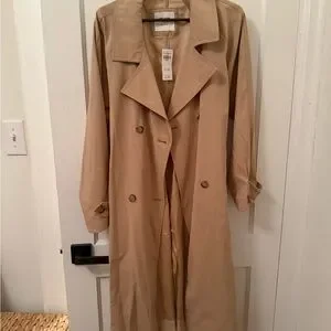 Stylish tan trench coat by Hollister. Double-breasted design. Ideal for versatile wear.