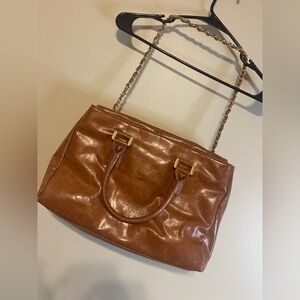 Elegant brown leather bag with gold accents. Perfect for any occasion. It does have a few cracks on the left front side and on the top flap from sitting position. Gently used on the inside