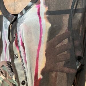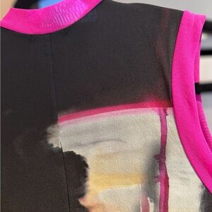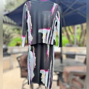 Absolutely stunning sleeveless dress and matching jacket by PETIT POIS by Viviana G. Beautiful sleeveless midi dress 43" length with bold black and fuchsia accents. Unique abstract design for a modern look. 100% nylon mesh and never worn!! Gorgeous, and figure flattering stretchy mesh. Very CLASSY🤩