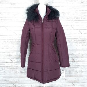 This is a new puffer coat with faux fur trim.