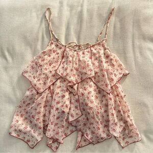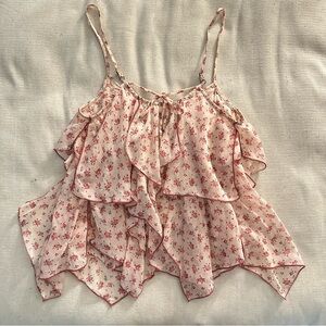 Chic pink camisole with floral pattern. Layered ruffle design. Spaghetti straps for a delicate look.