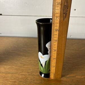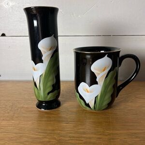 Beautiful vintage set by Otagiri Japan featuring a mug and matching bud vase, both hand-painted with elegant white calla lilies on a glossy black background. Perfect for displaying fresh flowers or enjoying your favorite drink.