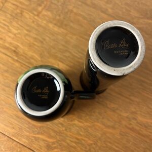 • Magnifique ensemble vintage signé Otagiri Japan comprenant une tasse et un vase assorti, tous deux peints à la main avec de délicates fleurs de calla sur fond noir brillant. Idéal pour présenter des fleurs fraîches ou savourer votre boisson préférée.