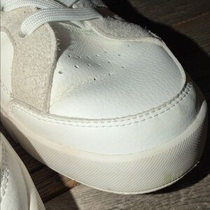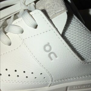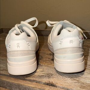 Sleek white athletic shoes with gray details. Perfect for active lifestyle. Comfortable and modern design. The Roger. Size 9 in women’s. Bought and tried on maybe worn once.