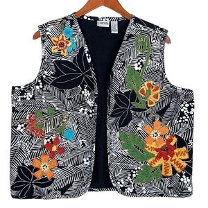 Chico’s Colorful Embroidered Flowers Black & White Tropical Print Open Vest