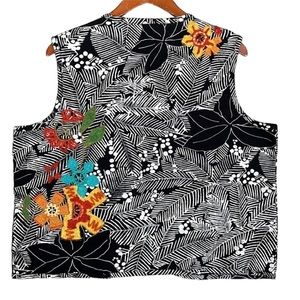 Chico’s, Colorful Embroidered Flowers, Black & White Tropical Print, Open Vest. Black and white tropical print with colorful embroidered flowers with cutout detail. Chicos size 3, XL/16. See photos for measurements to ensure fit.