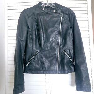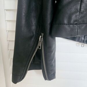 Sleek and stylish black leather jacket for women. Perfect for a chic and night out. Good condition and worn once. Small flaking on back and sleeve as well as inside collar as shown in photos.