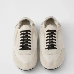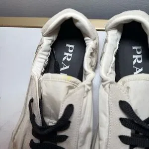 Worn a few times, small yellow mark as shown in photos. Size 8.5. Great condition otherwise. Super light weight, very chic, from the runway. This incredibly lightweight sneaker with a structured design made of Re-Nylon and suede leather features a mix of materials that embodies Prada's sporty and artisanal soul. Its flat sole is enriched with elastic on the sides, making it easy to slip on.
