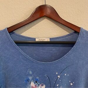 Artsy and stylish Jess & Jane tunic top in a soft washed blue with a distressed, textured fabric finish.