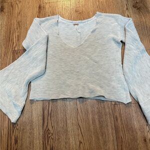 A classic Free People vibe — effortless, flattering, and perfect for everyday wear. This gray striped ribbed crop top features a soft knit feel, subtle ribbing, and a flattering V-neckline. The feminine bell sleeves add that signature FP flowy touch.