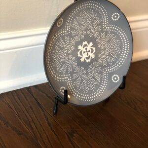 Details: Baum Brothers 8” Phara Gray/White Floral Geometric Round Salad Plate. Elegant gray plate with intricate white patterns. Perfect for display or serving.